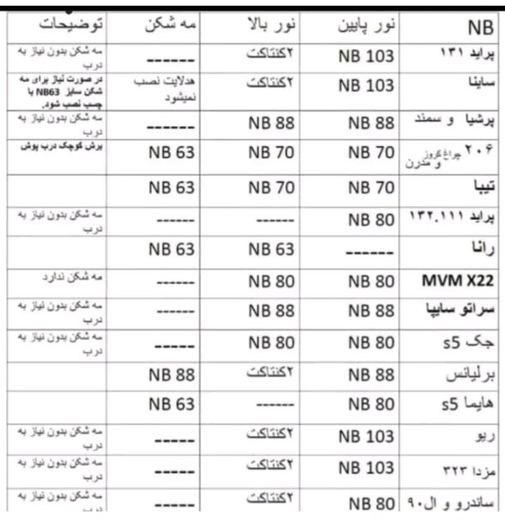 - پراید صبا ، 131،، مزدا 323، ریو، پراید 151، ساینا، کوییک ، شاهین ، وتمامی خودرو هایی که دارای لامپ دو کنتاکت هستند و دارای کیفیت بالا